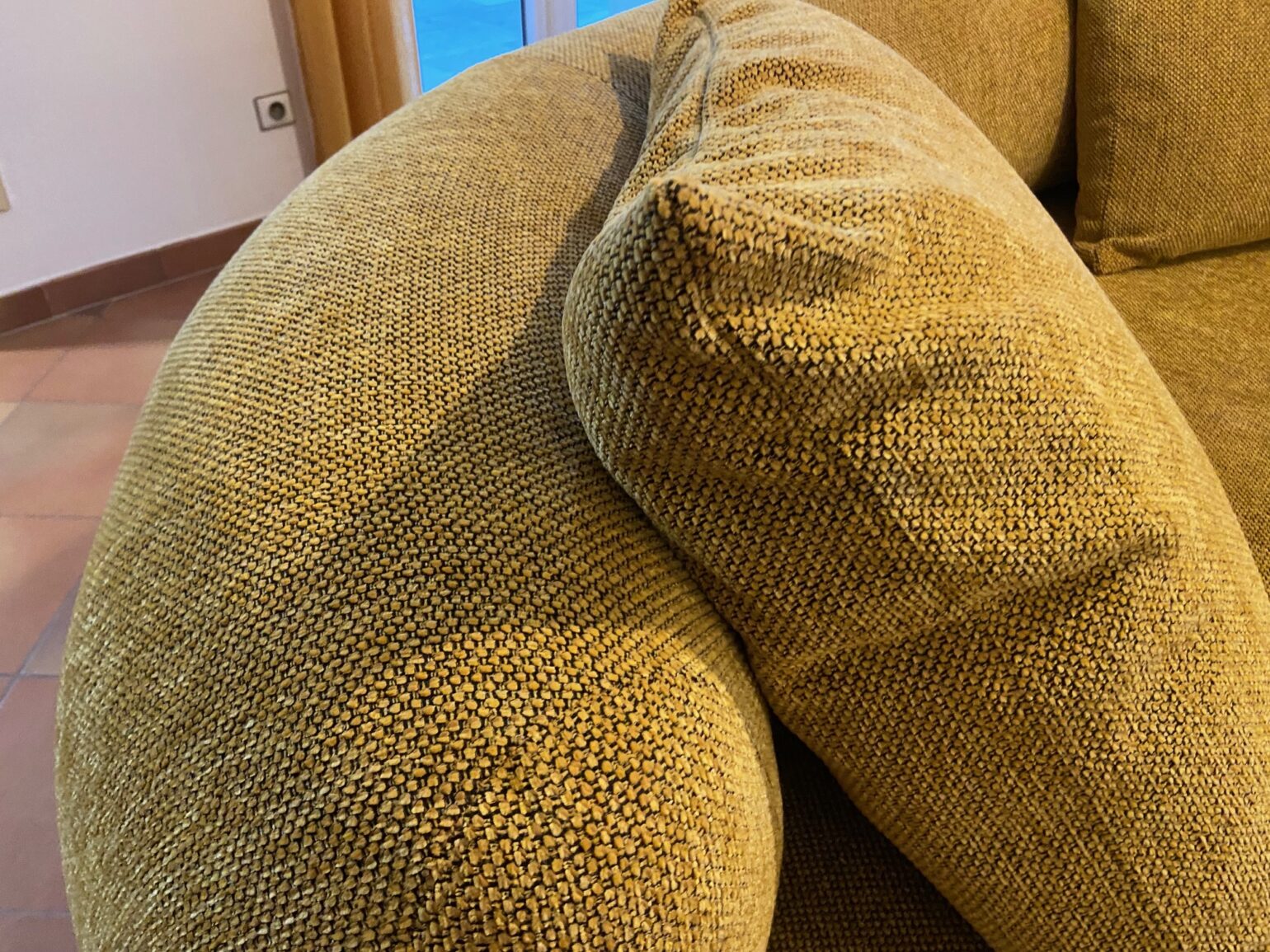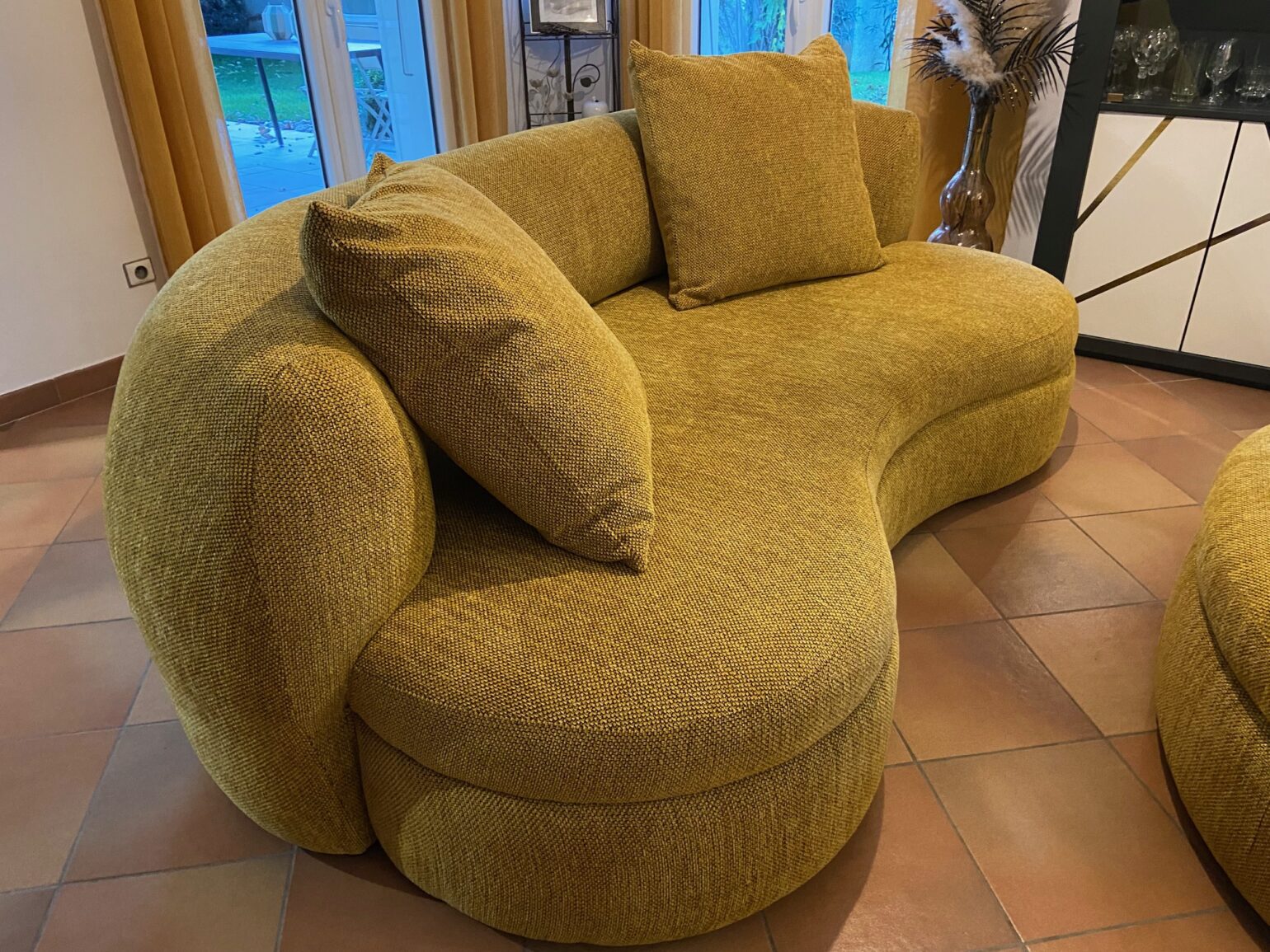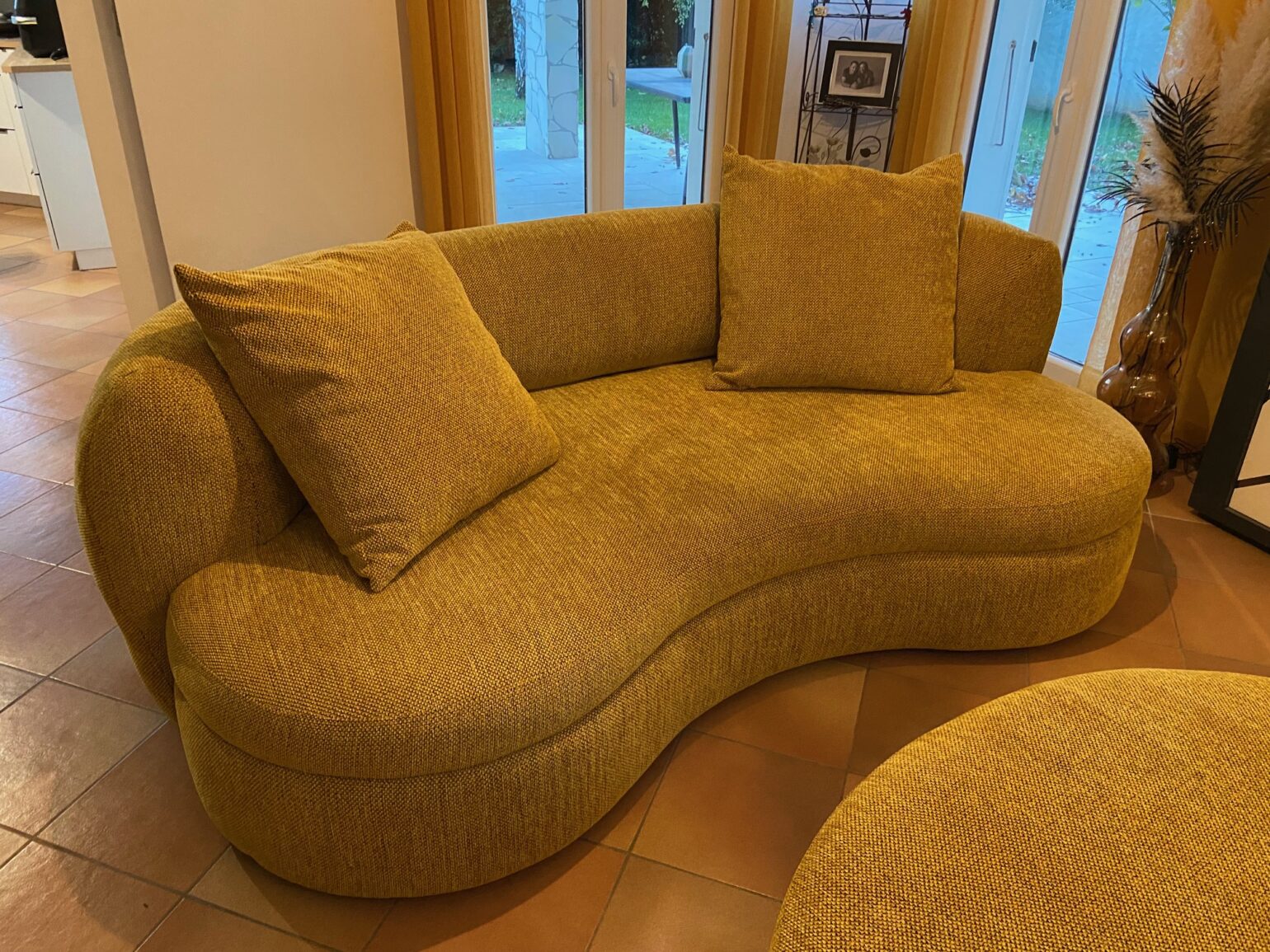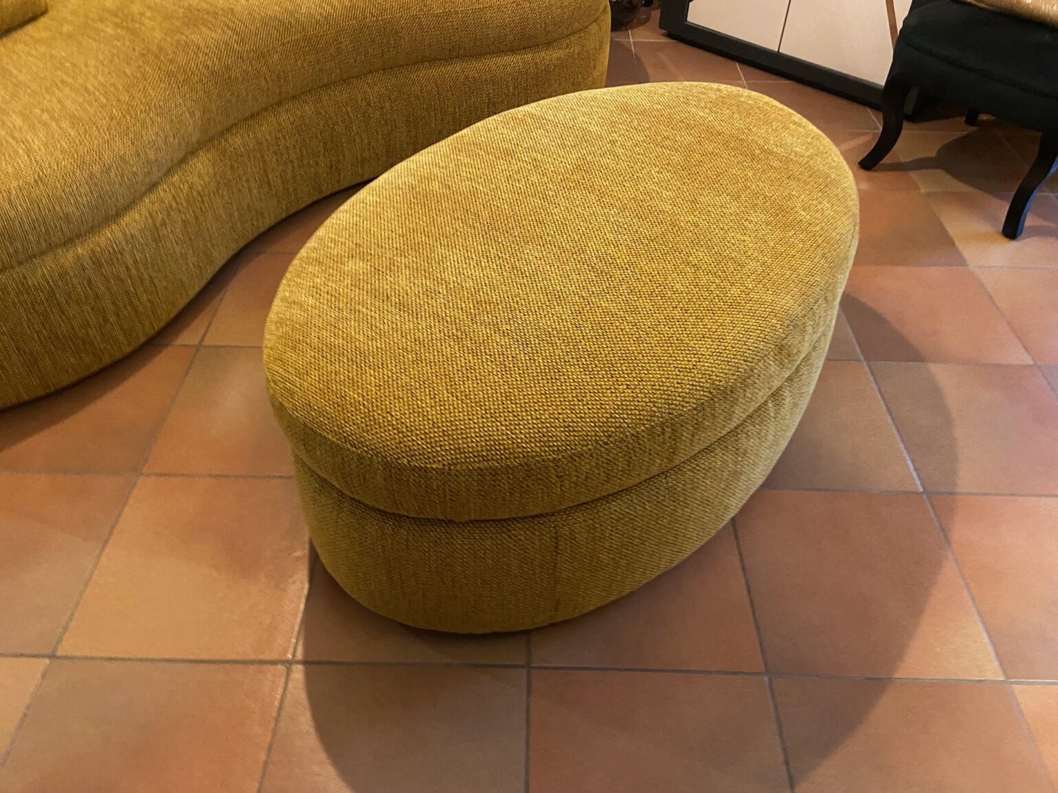 A noter que le pouf a la forme pour se coller au canapé.