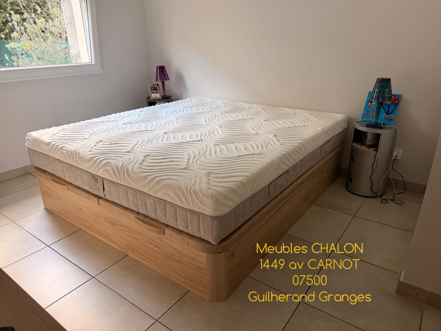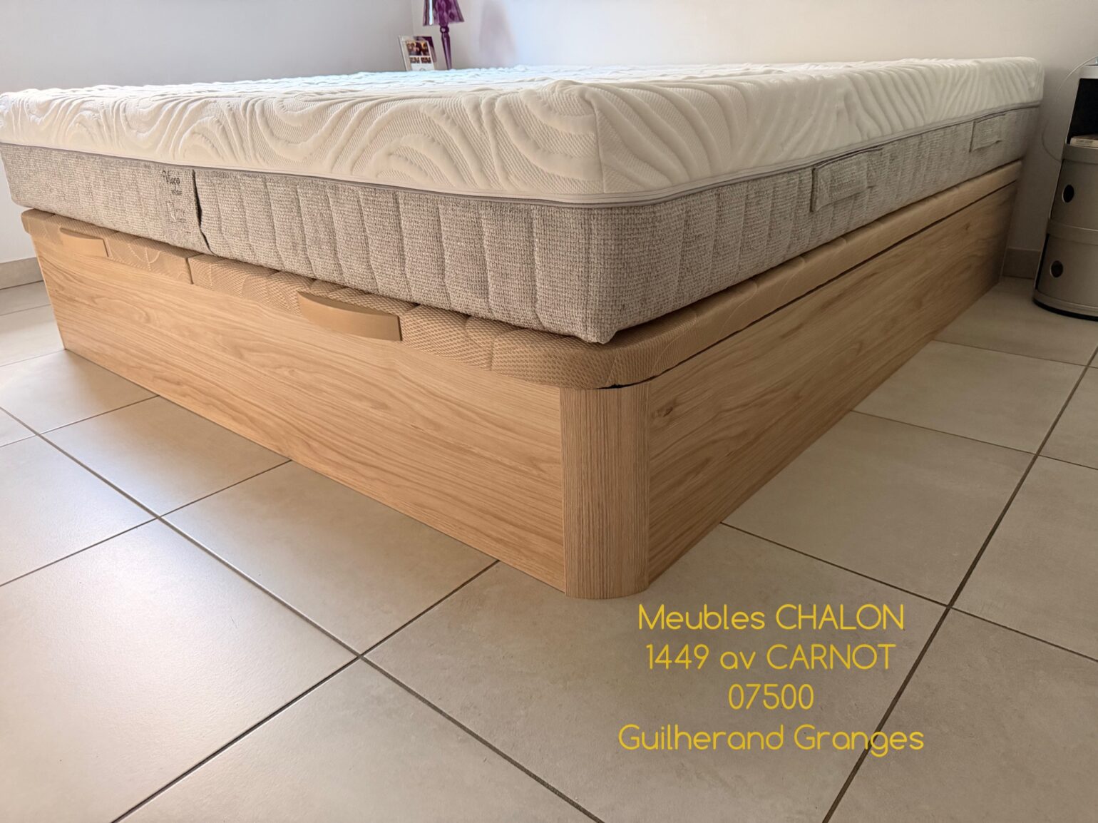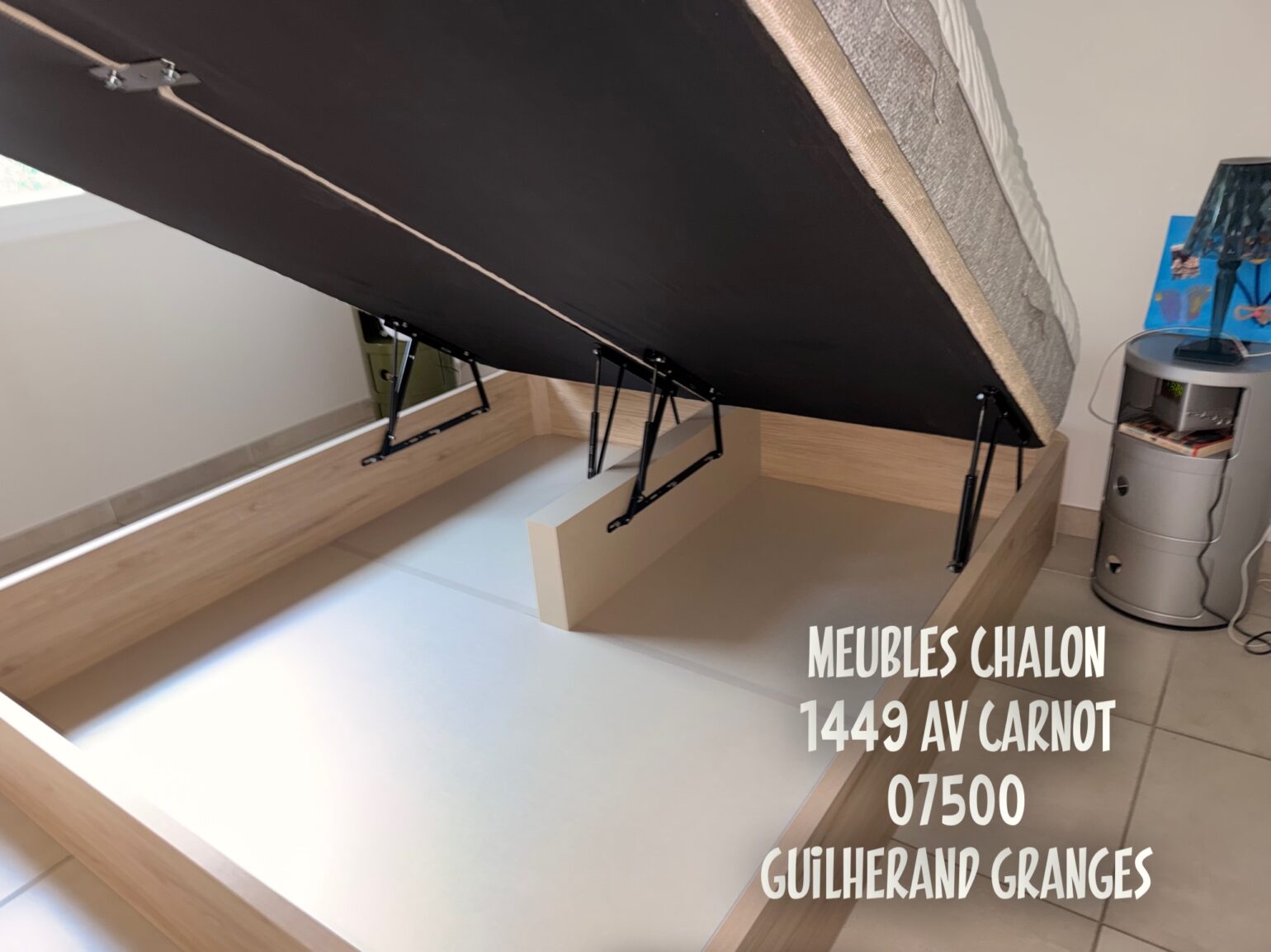 Relevage aidé par 4 vérins, couchage en 180×200 coffre de rangement de 30 cm de profondeur.