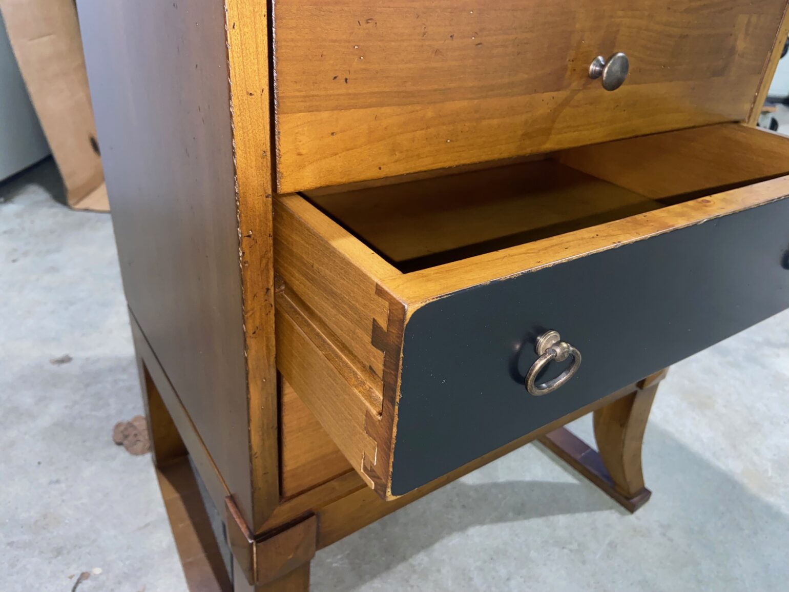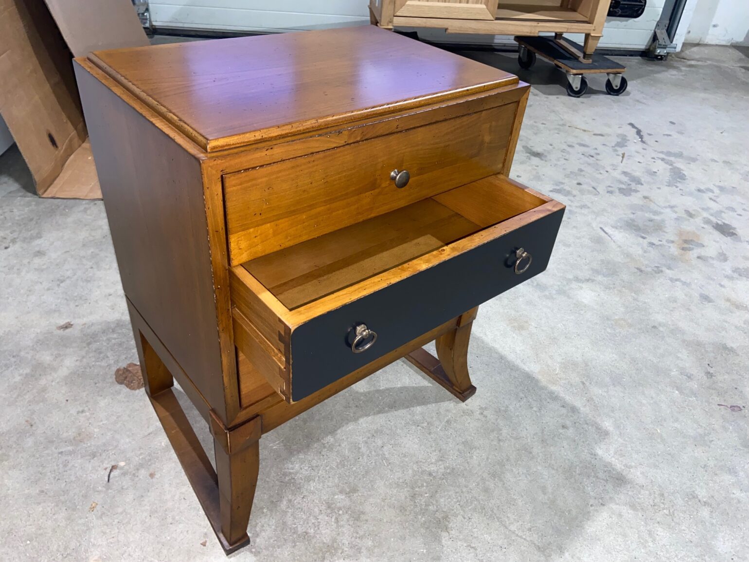 1 tiroir laqué et vieilli en noir, structure en merisier massif teinte moyenne vernis brillant.